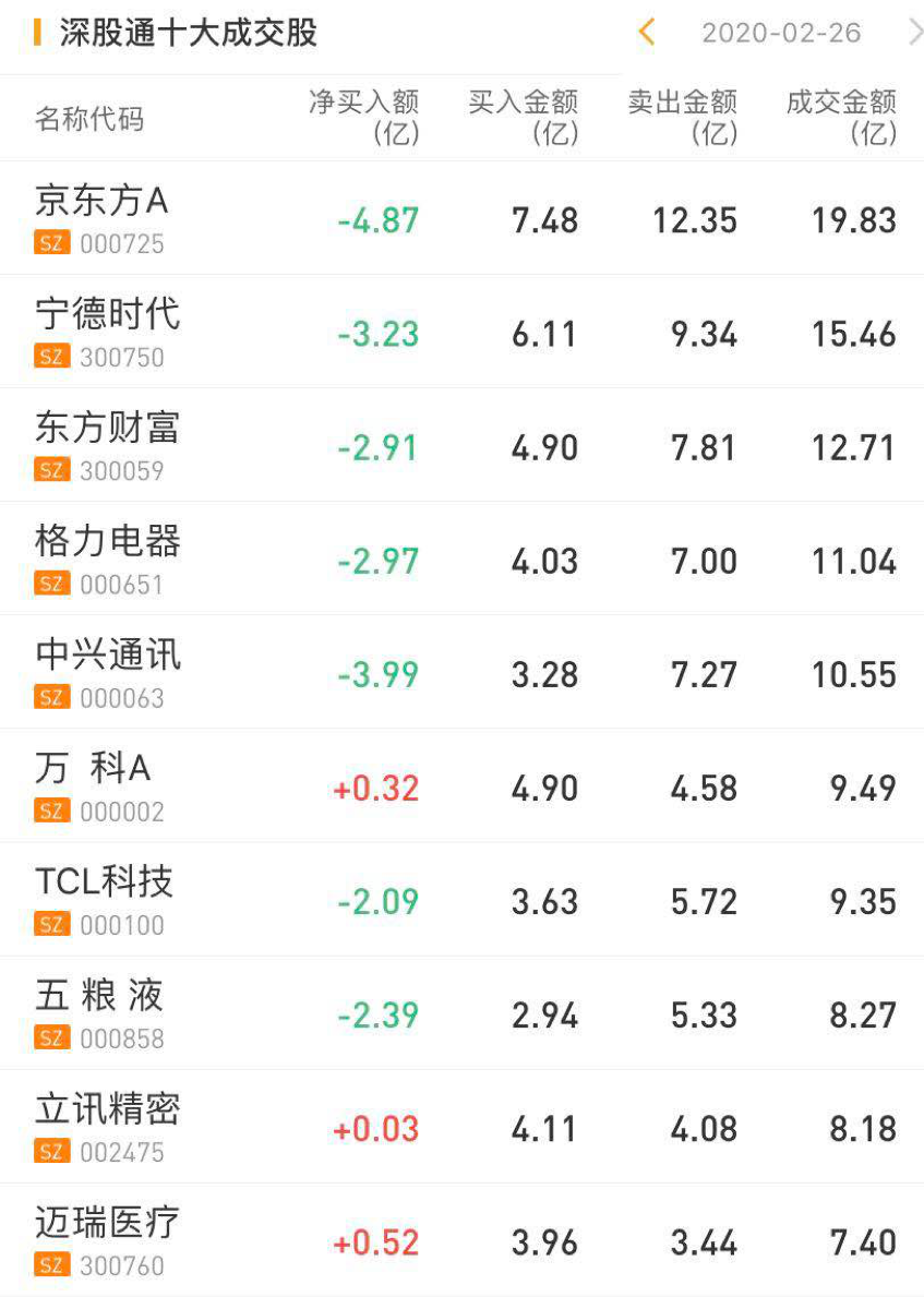 深股通净卖出京东方A4.87亿元,净卖出中兴通讯3.99亿元,净卖出宁德时代3.23亿元。