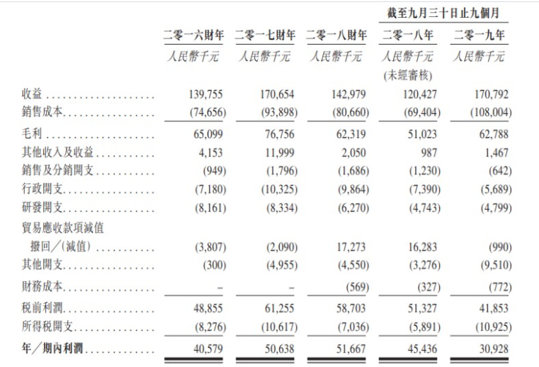 招股书数据显示,九尊互娱2016-2018财年及2019财年前9月总收入分别为1.40亿元、1.71亿元、1.43亿元及1.71亿元;毛利分别为6509.9万元、7675.6万元、6231.9万元及6278.8万元,净利分别为4057.9万元、5063.8万元、5166.7万元及3092.8万元。