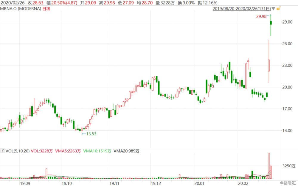 格隆汇2月26日丨美国药企Moderna(MRNA)今日再度大涨,盘中股价一度涨超25%,最高报29.8美元创历史新高;现涨幅为20.5%,报28.63美元,暂成交9.19亿美元,最新总市值为103亿美元。