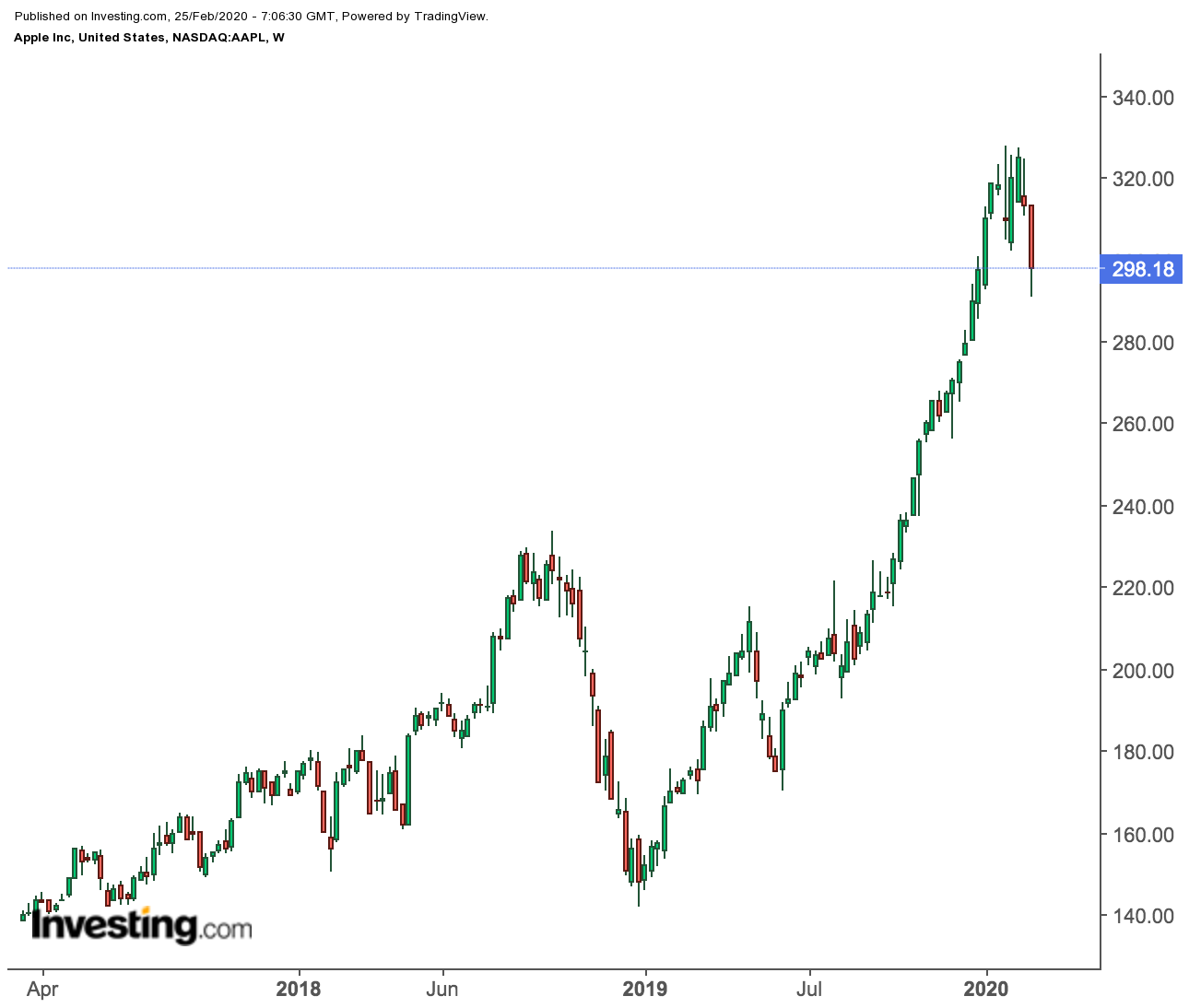 苹果周二下跌3.4%,收于288.08美元,过去四个交易日跌幅累计接近11%。同期,道琼斯工业平均指数下跌了7.7%。