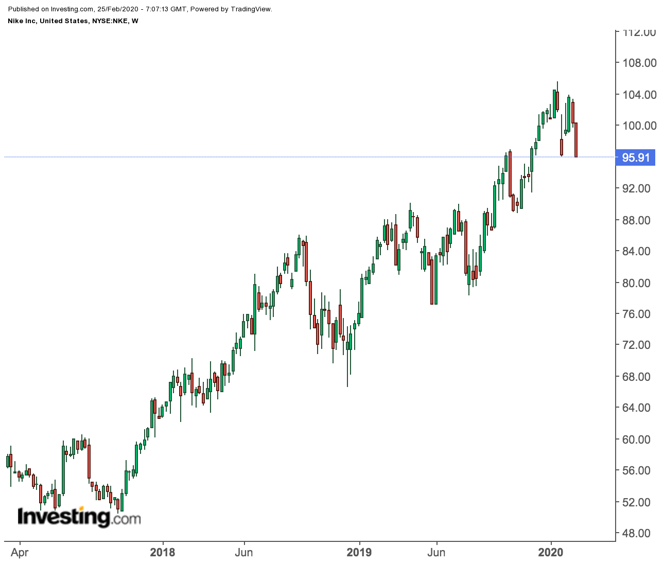 运动服装巨头耐克 (NYSE:NKE)是另一只容易受到全球范围内疫情蔓延影响的超大型消费股。本月初,耐克表示,其在中国的约一半门店已经关闭,并预计此次公共卫生事件对其中国业务将产生“重大影响”。