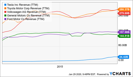 特别是对于那些相信世界汽车年销售量已经达到‘峰值’的人而言,他们不得不期望特斯拉未来的收入增长中的很大一部分是‘抢夺’主要竞争对手的其它车企的市场份额。其中包括日本的丰田、德国的大众、以及美国的通用和福特。目前这四家公司合计的年收入超过 8000 亿美元,而特斯拉的 2020 年收入估计约为 300 亿美元。
