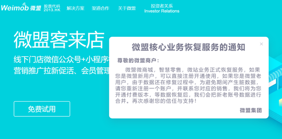2月26日,针对微盟集团近期出现的系统故障问题,微盟集团发出通告表示,目前微盟微商城、智慧零售、微站业务正式恢复服务,新用户可以直接注册开通使用。微盟老用户由于数据还在修复中,为避免期间产生脏数据,需要重新注册账户,待数据恢复后可进行新老账户合并。