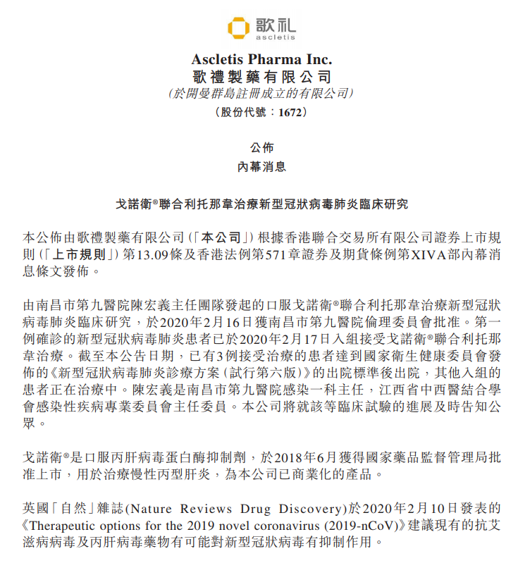公告显示,第一例确诊的新型冠状病毒肺炎患者已于2020年2月17日入组接受戈诺卫®联合利托那韦治疗。