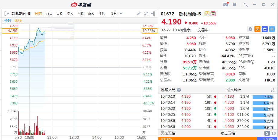 歌礼制药(01672)大幅走高,三肺炎患者服用旗下药品治愈出院,截至发稿,歌礼制药涨10.55%,报价4.19港元,市值净增超4亿港元。