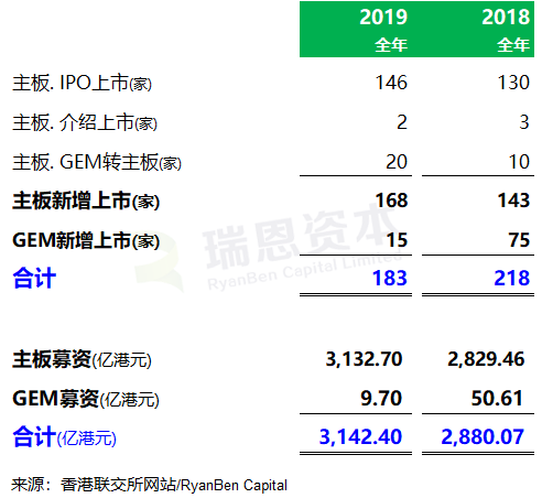 2019全年新上市公司 183 家,其中包括:IPO上市163家、介绍上市2家、创业板(GEM)转主板20家。
