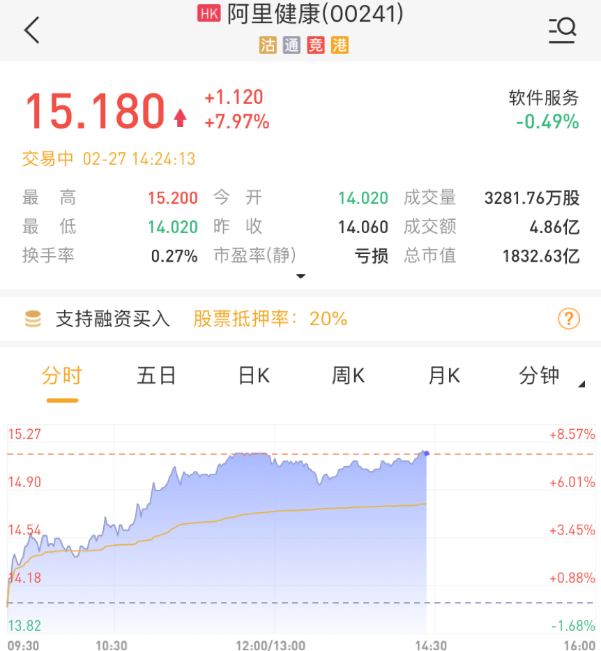 华盛资讯2月27日讯,获中金看多,阿里健康(00241)午后继续拉涨,盘中一度涨超8%。截至发稿,阿里健康大涨7.97%,现报15.18亿港元,当前总市值达1832.63亿港元。