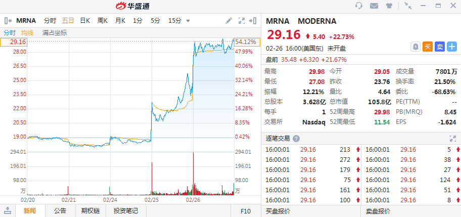 然而,不计近两个交易日,公司股价在今年内股价累计跌4.96%,并不算太理想。截至今日收盘,Moderna报29.16美元,涨22.73%,换手率的36.14%,最新市值96.28亿美元。