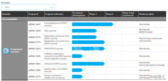 截至目前为止,公司在研24种mRNA药物,其中12种处于临床研究阶段,四个项目处于第二阶段研究。有一个项目正准备进行第三阶段研究。但就目前而言,Moderna尚无任何已获准上市的mRNA药物或疫苗。