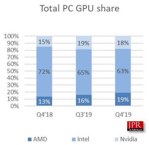 IT之家了解到,JPR的统计数据显示,2019年第四季度,在GPU总出货量方面,英特尔第一(63%),AMD第二(19%),英伟达第三(18%)。在独立GPU出货量方面,AMD从去年的26%上升到27%,英伟达则是占有73%的独立GPU市场份额。