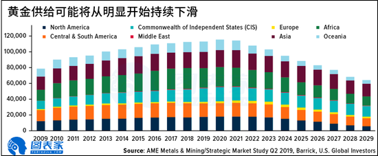上图显示,全球黄金产量将从明年开始逐渐减少,10年后或将处于多年来的低点。由于黄金稀缺性的上升,金价将进一步走强。