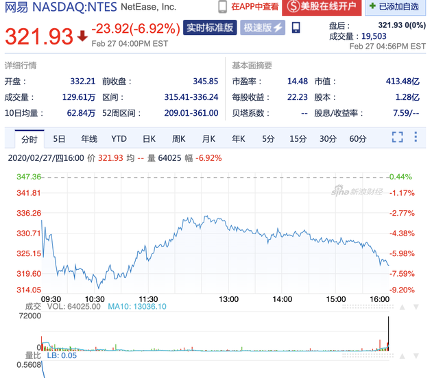 新浪科技讯 北京时间2月28日消息,网易周四收盘股价下跌6.92%,报321.93美元。