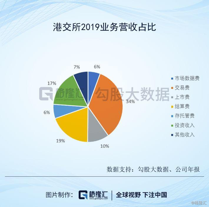 从各个业务板块来看,2019年交易费、结算费和投资收入贡献了港交所的主要营收收入,分别占比为34%、19%和17%;上市费、其他收入、数据费和存托管费分别占比11%、7%、6%和6%。其中,港交所的交易费和结算费占营收占比近7年来首次低于40%和20%。