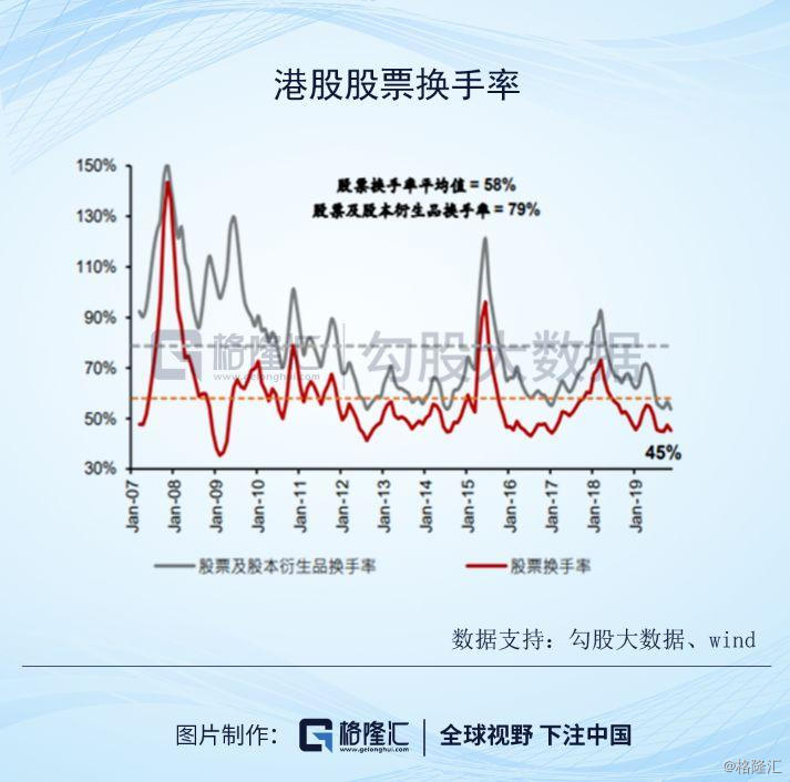 2019年,港股市场日均成交额只有876亿港币,同比下跌18.44%。港交所的股票市场换手率在2019年前11个月一直保持下降趋势,11月接近历史低位(45%),同时证券市场日均成交额同比下降 20%。