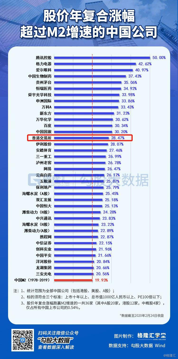 港交所自上市以来股价年均复合增长率为28.47%,是极少的可以跑赢M2增速的股票之一,多年以来为坚信其价值的投资者带来丰厚的收益。