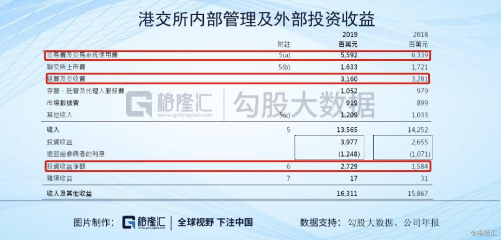 2019年因为港股市场的低迷,港交所两个最主要的营收来源交易费和结算费用均拖累了业绩增长,全年业绩保持了正增长的主要原因是投资收益贡献了27亿的营收,同比大增72%。2019年全球各类资产和主要市场都取得了较好的收益率,港交所一方面内部管理基金的利息收益增长,另一方面外部管理的投资组合获得了很好的收益,使得投资收入强劲。