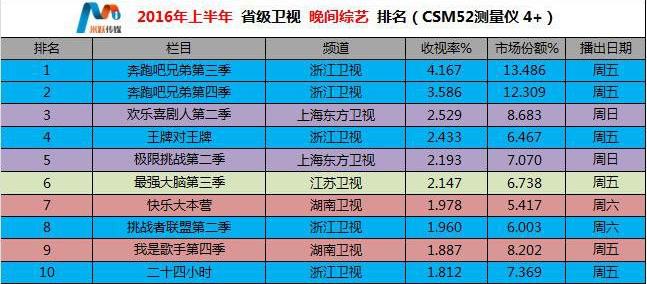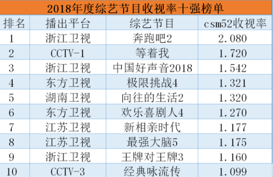 2016年到2018年,在综艺行业监管趋严,市场也更加竞争激烈的背景下,综艺前10榜单整体成绩后退,榜单第一名的收视率从4下滑到2,2019年更惨,即便是大牌明星云集的收视王“奔兄”也后退到了1.8。
