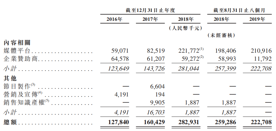 近年来煜盛文化的营收增速有所加快,2016年煜盛营收127.8百万元,2018年营收达282.9百万元,复合年增长率48.8%,其中2018年的营收增速同比增长一倍。营收增速加快主要是源于媒体平台的收入增加,其中2018年媒体平台收入从82.52百万增长至2.21亿元。