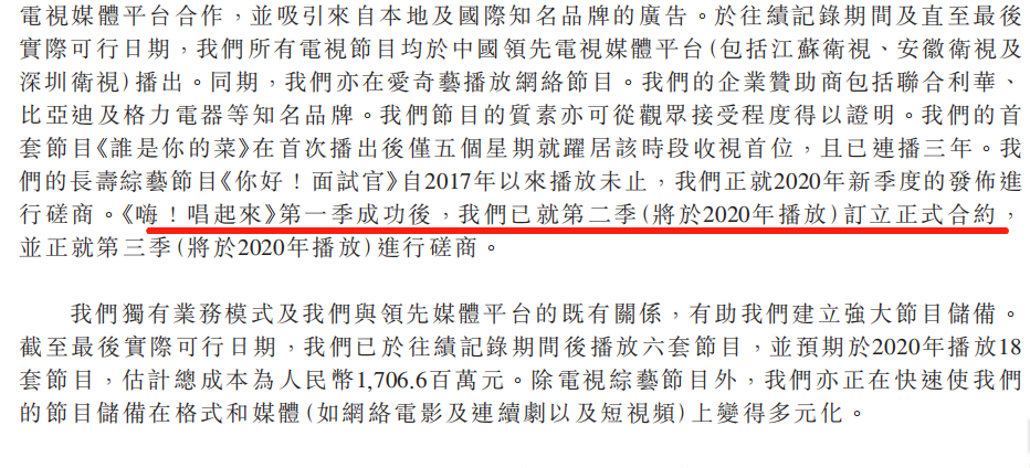 丰富的优质媒体平台的合作经验,更有利于综N代的营销,为煜盛文化带来更稳定的业务收入,比如就市场反响积极的《嗨!唱起来》,煜盛文化已和媒体平台签约并于2020年推出第二季。