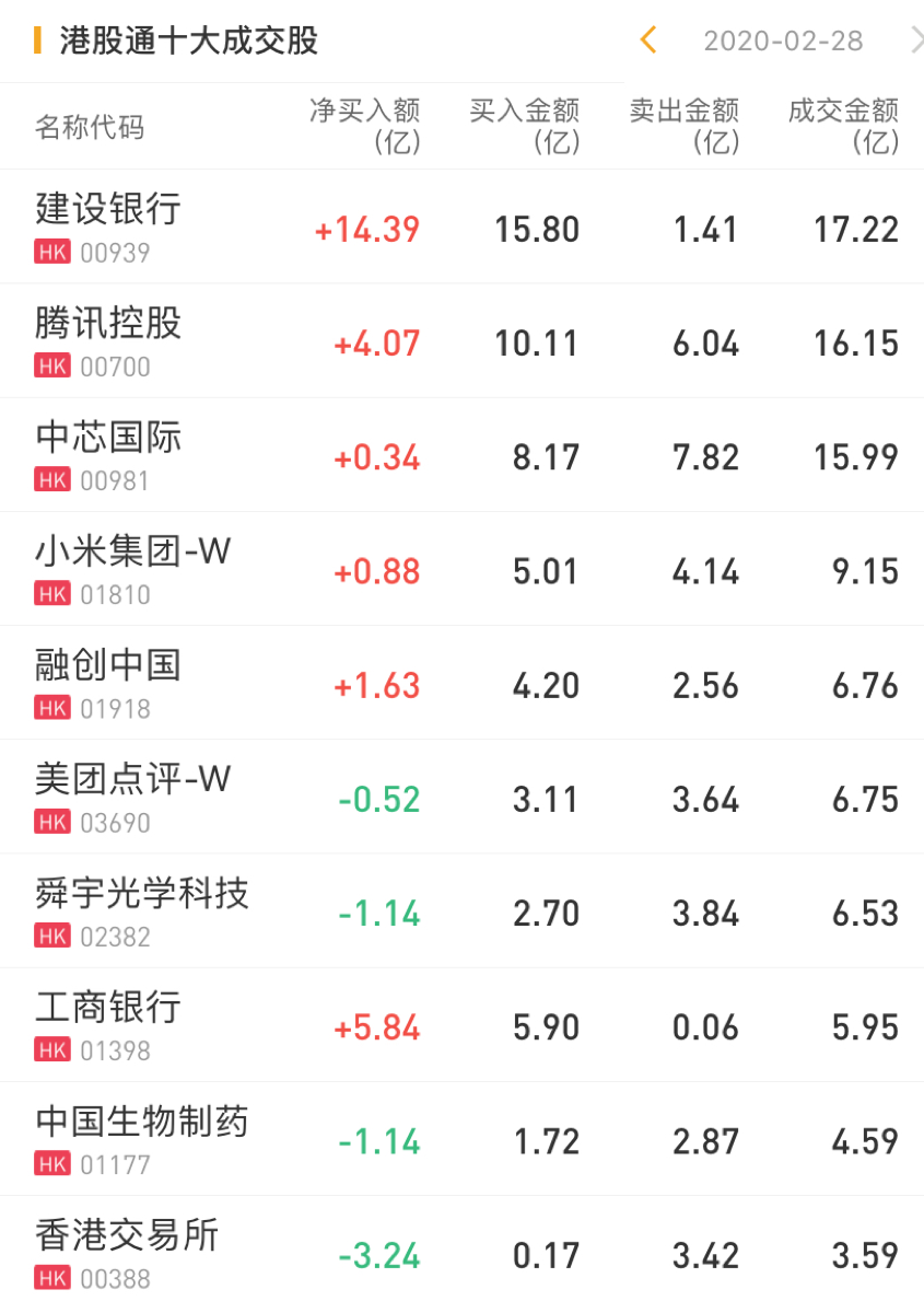 今日净买入腾讯控股4.07亿港元,净买入建设银行14.39亿港元,净买入融创中国1.63亿港元,净买入小米集团0.88亿港元。