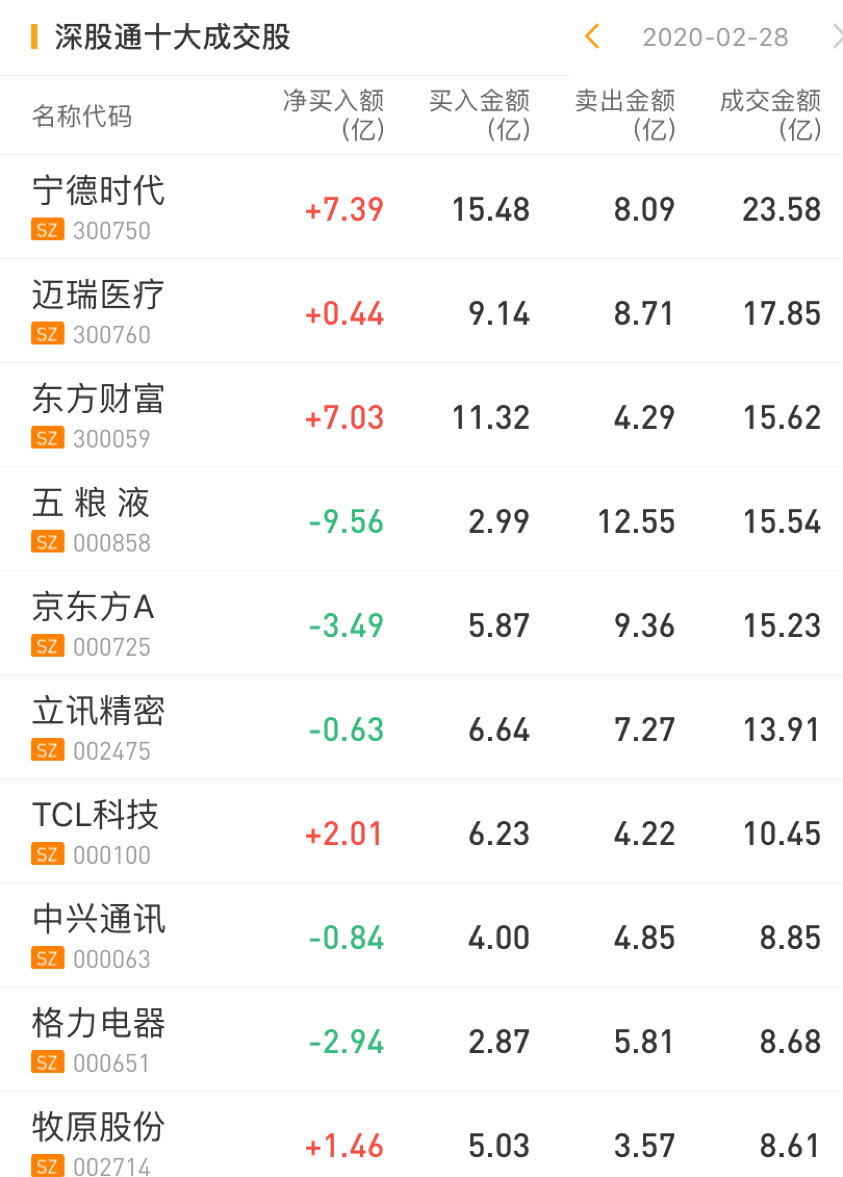 深股通净买入宁德时代7.39亿元,净买入东方财富7.03亿元,净卖出五粮液9.56亿元。