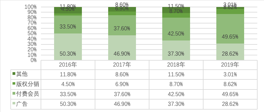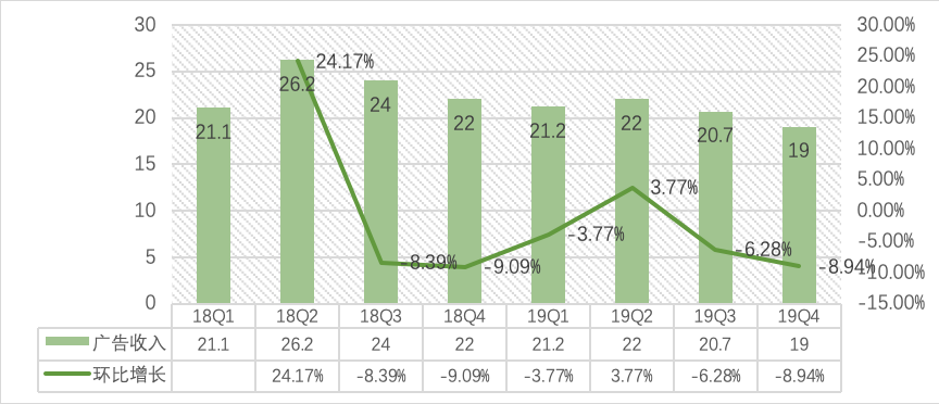 Q4广告收入达到19亿元,环比下降8.94%,同比下滑15%。广告收入的持续下滑,笔者认为既有宏观经济的原因,也有竞争对手的原因。2019年整体的广告环境是不佳的,不仅仅是爱奇艺在下滑,百度、腾讯以及传统媒体都表现逊色,无论是效果广告还是品牌广告,都在受到宏观经济的冲击;雪上加霜的是,抖音头条系列还加剧了效果广告的竞争,存量市场的肉搏战使得爱奇艺广告分部表现不振。