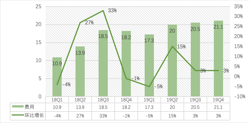 随后是费用(销售、管理费用和研发费用)的变化。爱奇艺Q4费用为21亿元,较上年同期的18.3亿元同比增长15%。其中,Q4销售及管理费用为14亿元,同比增长15%;研发费用为7.11亿元,同比增长17%。此外全年费用为79亿元,较2018年的61亿元同比增长29.5%。费用方面整体有一定的增加,但控制的还算妥当,研发费用的持续提升也可以为后续增长提供基础。