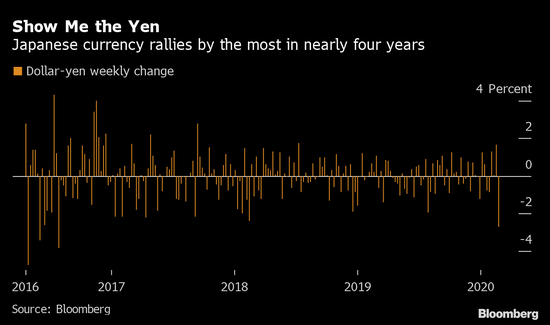 日元本周已经上涨2.8%,有望取得2016年以来的最大周涨幅,并领跑全球主要货币。欧元紧随其后,取得2017年以来最大涨幅。