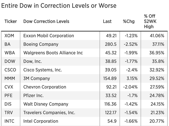 道琼斯指数的所有30只成分股均处于回调区间,较52周高点下跌至少10%。 埃克森美孚和波音分别从50周高点下跌了约40%,而思科和3M分别下跌了约30%。