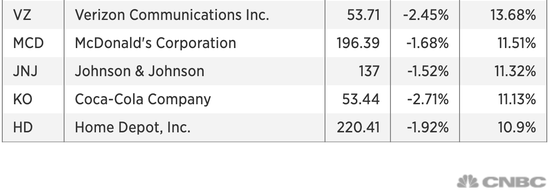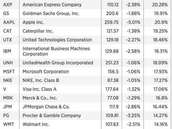 苹果公司股价在1月29日创下历史新高,达到每股327.85美元。 周五该公司股下跌逾4%,至261美元左右。 但是,苹果公司并不是道琼斯工业平均指数中近期唯一被重创的成分股。