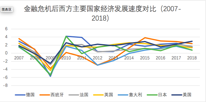 其次,美国经济基本面的支撑。金融危机后,在美联储的强刺激下,相对于其它发达国家,美国经济能够迅速恢复增长,成为推动美国股市上涨的基本因素。如果把2007-2018年经济增长速度做对比,在西方主要经济大国中,美国经济增长速度连续多年处于前列(如下图)。