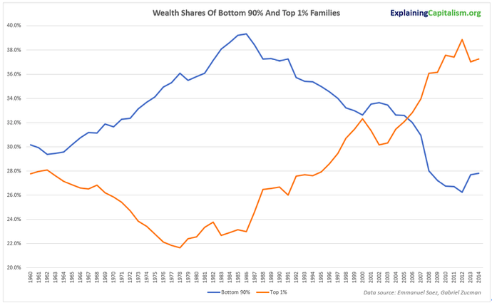 上图显示,美国最富有的1%家庭在全国财富的占比在1970年代末开始从略低于22%持续上升,而美国最贫穷的90%家庭在全国财富的占比自1980年代中期开始从略高于39%持续下降。两者在2000年代中期交叉,即在2008年全球金融危机前期,美国最富有的1%家庭占有近全国1/3的财富,与美国最贫穷的90%家庭占有的财富持平。此后,各自的趋势继续发展,截至2014年,美国最富有的1%家庭占有全国财富的37%左右,而美国最贫穷的90%家庭占有的全国财富比例不到28%。