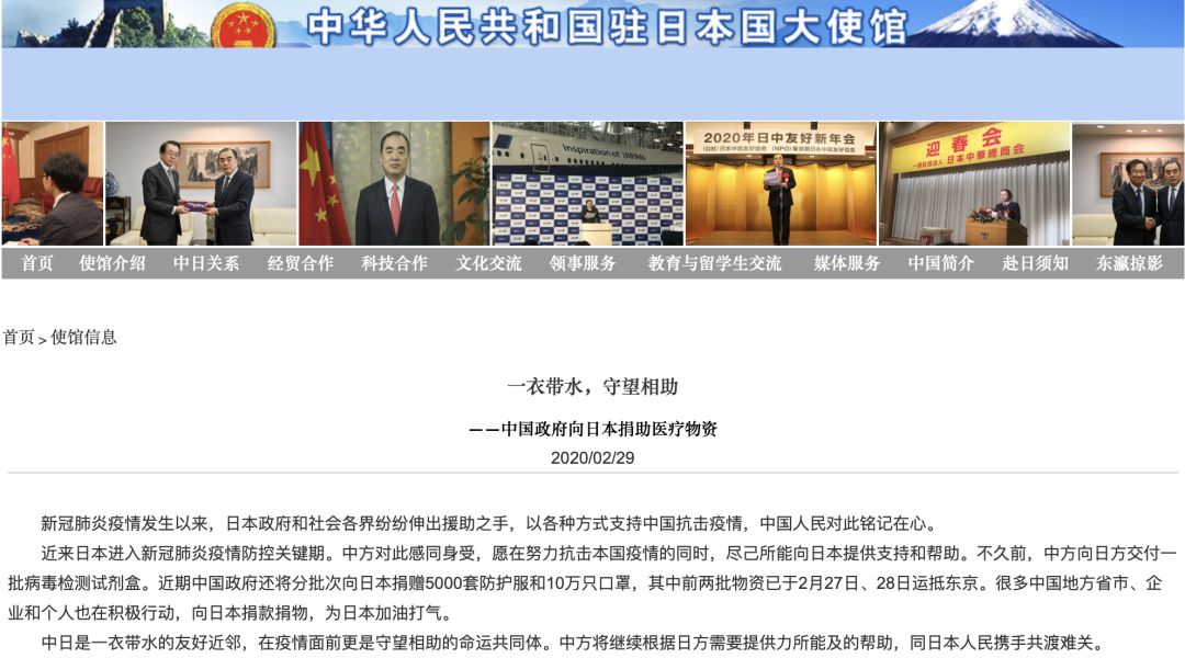 2月29日,据中国驻日本大使馆官网消息,新冠肺炎疫情发生以来,日本政府和社会各界纷纷伸出援助之手,以各种方式支持中国抗击疫情,中国人民对此铭记在心。