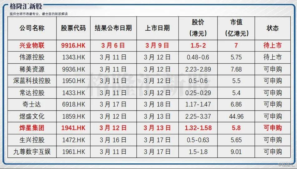 与此同时,兴业物联(9916.HK)和伟源控股(1343.HK)的上市在即,以及另外8家公司陆续进入招股期,也不禁让人们对3月份的新股市场多了的几分期许。