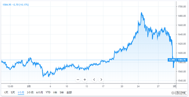 然而,作为重要的避险工具,金价在经历一波暴涨随着疫情的蔓延突然开始暴跌。Choice数据显示,现货黄金从2月3日报1580美元/盎司起,一路飙升,至2月21日报1640.59美元/盎司,创下了自2013年1月以来的最高记录。不过,2月28日晚间,收报1587.3美元/盎司,下跌幅度达到3.36%。