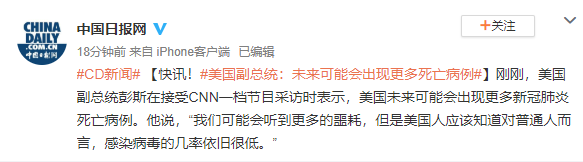 原标题:快讯!美国副总统彭斯:未来可能会出现更多死亡病例 来源:中国日报网微博