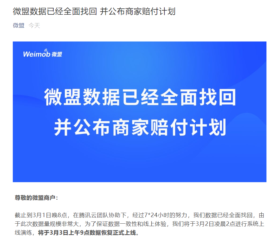 3月1日晚间,微盟在其官微上表示,数据已经全面找回,并将于3月3日上午9点数据恢复正式上线。同时,为了弥补事故对商家造成的影响,微盟准备了1.5亿元人民币赔付拨备金,其中公司承担1亿元,管理层承担5000万元。