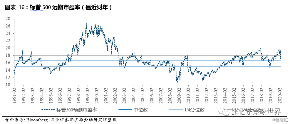 第一,过去半年美股走牛,某种程度是一种“水牛幻觉”,美股估值持续处于相对高位。一方面,美联储持续降息、扩表,美国无风险收益率持续下行;但另一方面,基本面的支撑不强,彭博2020财年一致预期EPS开年整体处于下行区间。大跌前的2月21日标普500预测市盈率为19.2倍,高于1990年以来的3/4分位数。大跌之后,市场对于2020财年彭博一致预期EPS较上周下降0.17%,估值有所下降但仍处于高位,标普500预测市盈率截至2月28日为17倍,处于1990年以来中位数(16.5倍)和3/4分位数之间。
