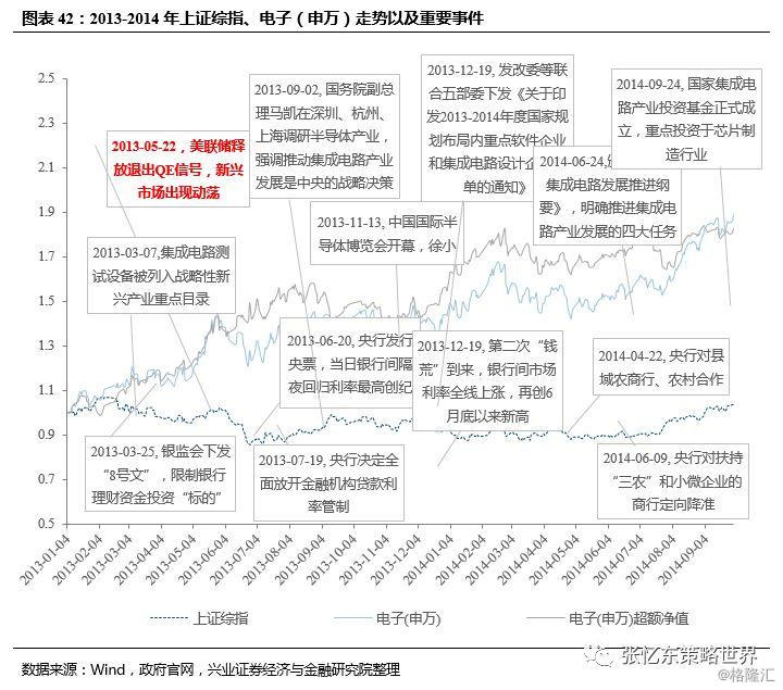 其次,中国科技股行情取决于中国宏观经济政策导向、监管政策、产业未来的共振。同样以13-14年电子行业为例,当时宏观经济下行压力大,传统行业产能过剩、库存高、债务压力大,因此,经济结构调整和优化,积极促进战略新兴产业就成为了宏观政策的重要导向,叠加资本市场对创新的支持,成为那一轮科技股行情的中长期动能。