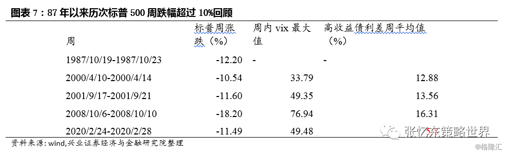 首先,“西风冷”如期来袭,20200224-20200228标普500指数下跌约11.5%。1987年至今,标普500指数单周跌幅10%以上的,只出现过4次:1987/10/19-1987/10/23“黑色星期一”那一周、2000/4/10-2000/4/14互联网泡沫破灭之初、2001/9/17-2001/9/21“9.11”事件后第一周、2008/10/10次贷危机时创下单周最大跌幅的那次。