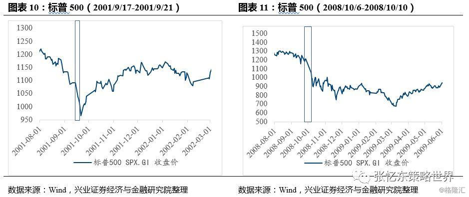 2001/9/21:“911”事件后开市第一周:“911”事件美股延后一周开市,9月17日为事件后第一个开盘日,之后标普500连续一周下跌,标普500指数从2001年9月10日收盘价1092.54开始下落,于9月21日下探至最低点944.75,周跌幅达到11.6%。下周开市后恐慌情绪缓和,股市开始上扬,标普500指数两周后(10月11日)恢复至下跌前的位置,随后开始慢牛行情。