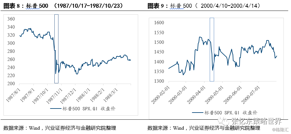 1987/10/23:杠杆并购泡沫破灭下的“黑色星期一”:标普500指数从“黑色星期一”的前一周就开始下跌,前一周周跌幅为9.12%;10月19日单日下跌20%,之后两日股价开始回升,20日、21日单日涨幅分别为5.33%、9.1%。在随后的一个月左右,美股进入慢牛行情。
