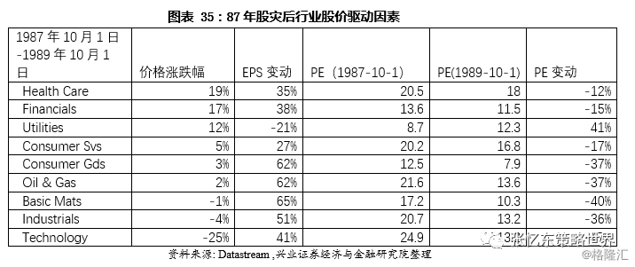 股灾后的美股上涨,并不依赖于估值的提升,主要靠盈利驱动。从1987年10月19日到1989年7月,标普500PE从16.84倍继续下降至12倍。从行业表现也非常明显,股灾后盈利成为驱动股价增长的主要动力。除了公用事业因为本身估值较低,PE还出现了一定程度上涨,其他行业估值都出现了不同程度的下降,股价的上涨主要来自EPS提升。