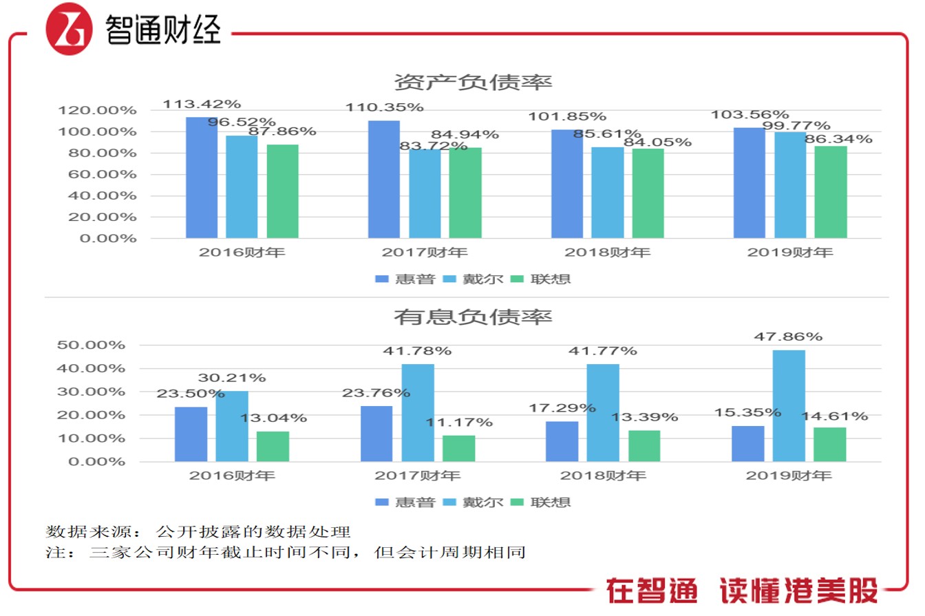 我们以三大全球PC端龙头惠普、戴尔以及联想作为对比。以过去四个财年看,就资产负债率而言,联想的负债率水平最低,以最新的财年季看,截至2019年10月31日,惠普资产负债率为103.6%,截至2019年11月1日,戴尔的资产负债率为96.7%,均远高于联想。