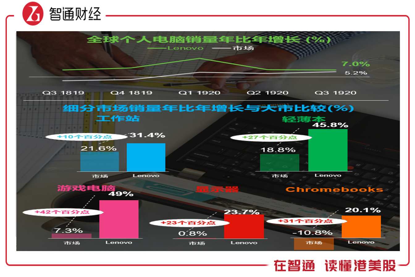 从全球市场看,基本和国内情况类似,联想的PC出货量增长也保持高于全球水平,2020财年Q3,联想PC出货量增长7%,PC市场份额稳固第一,市场份额24.8%,其中在细分市场,工作站、轻薄本、游戏电脑以及显示器均实现了双位数的增长水平。