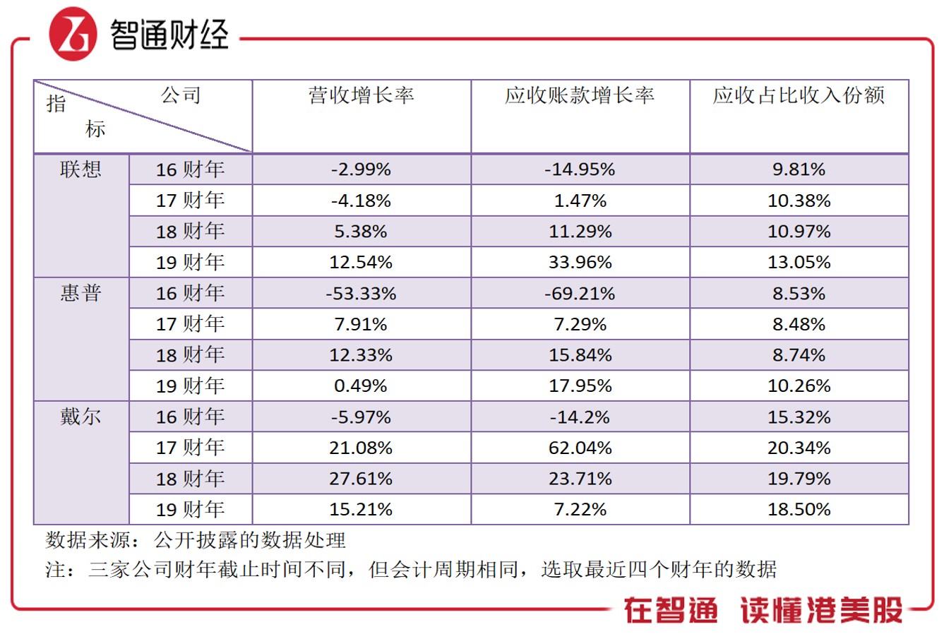 该沽空机构也拿经营性资产说事,智通财经APP整理的联想、戴尔以及惠普三家公司应收增长、收入增长以及应收占比三个指标进行对比。应收增长高于营收增长是行业特征,以惠普过去四个财年看,三个指标基本和联想保持一致。