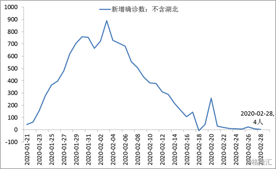 图表 5 湖北以外的每日新增确诊人数下降到个位数