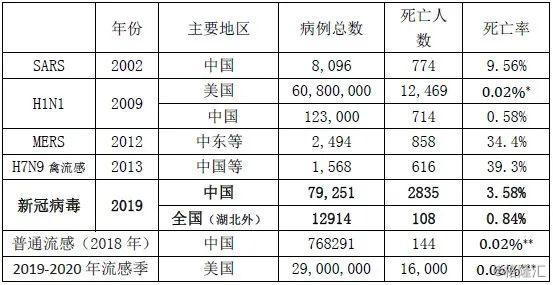 说明:* 2009年H1N1美国的数据是CDC事后建模预估的,当时由于疫情发展失控,后来没有统计和确认病例数了,据事后WHO的研究,当时H1N1在墨西哥境内死亡率为2%,在其他地区的死亡率为0.1%左右。**有研究认为中国疾控中心统计的流感数据可能被低估,因为确诊流感主要采用实验室检测,但并非所有具有上呼吸道感染症状的病人都进行过相关检测。***美国CDC在2月21日发布流感监测周报估计2019-2020年流感季美国已有至少2900万例流感病例,其中1.6万人死于流感相关疾病。