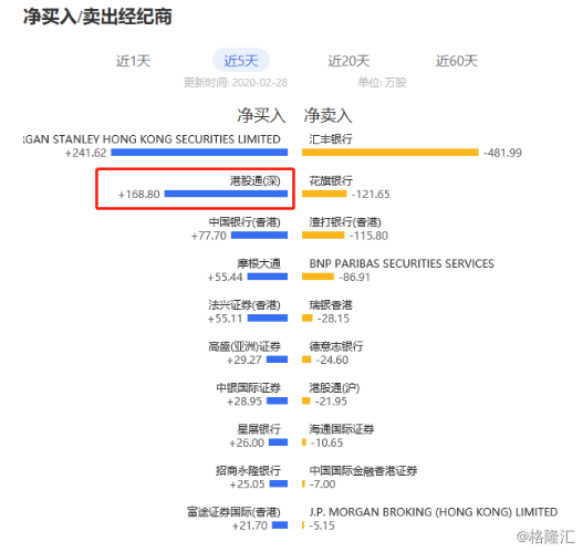 而对于南下资金而言,则选择在此时间段进行抄底。根据勾股大数据显示,在2月24日至2月28日期间,通过港股通(深)净买入位于净买入经纪商第二,交易达到168.8万股。其中光2月28日当日,港股通(沪)就净买入34.15万股,位列经纪商第三之位。