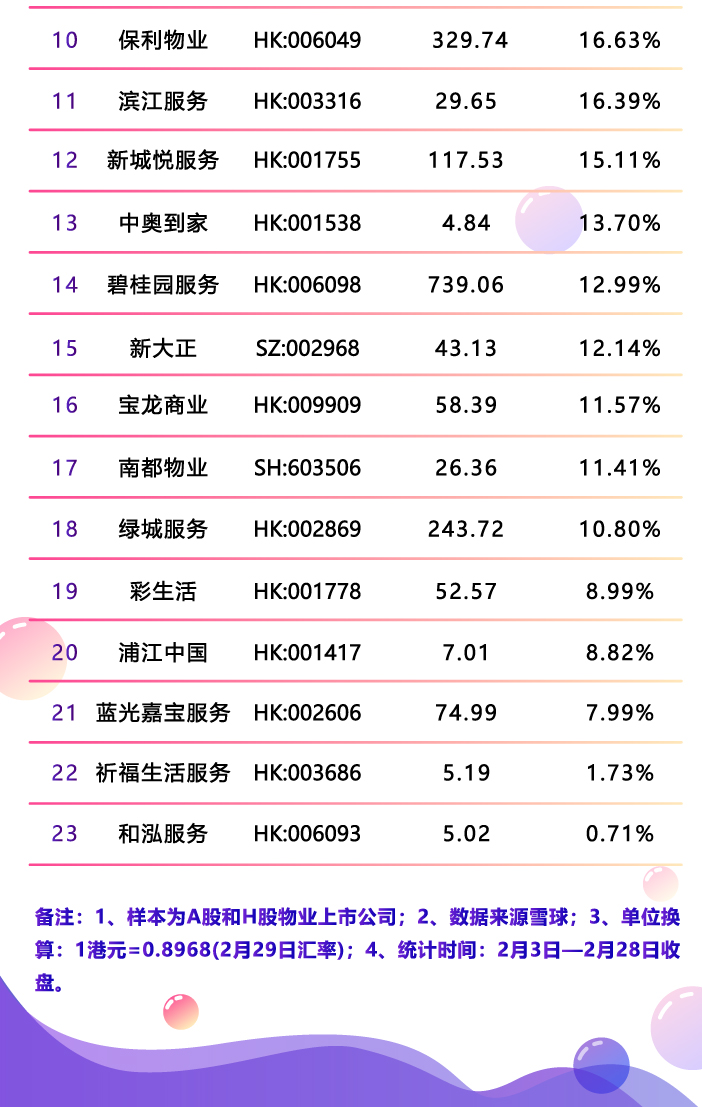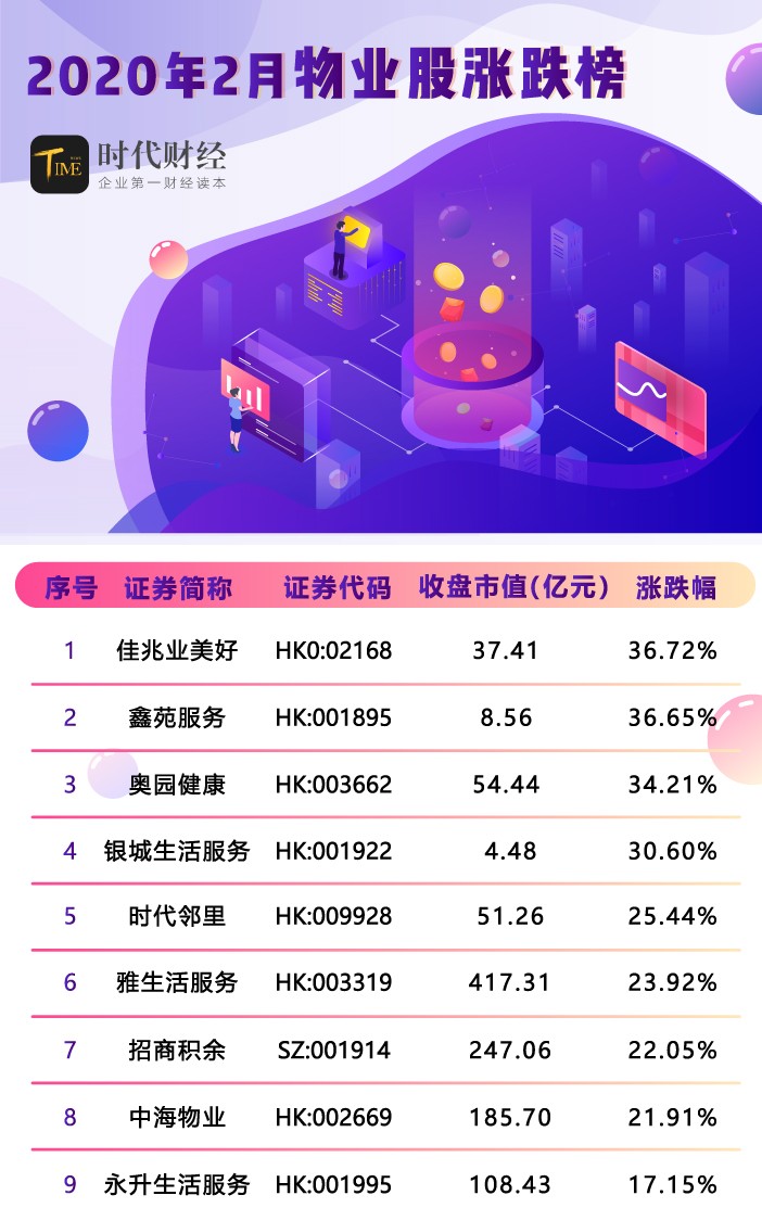 而传统物业管理的龙头企业如中海物业、雅生活服务、碧桂园服务等,整体呈现更为稳定的状态,涨幅普遍集中在20%上下。而和泓服务、祈福生活服务、浦江中国等在管面积普遍低于1000万平方米的“蚊型公司”,实际上并未能在此次机会中获取足够多的资本关注,涨幅普遍低于10%,和泓服务在整个2月市值仅上涨0.71%。